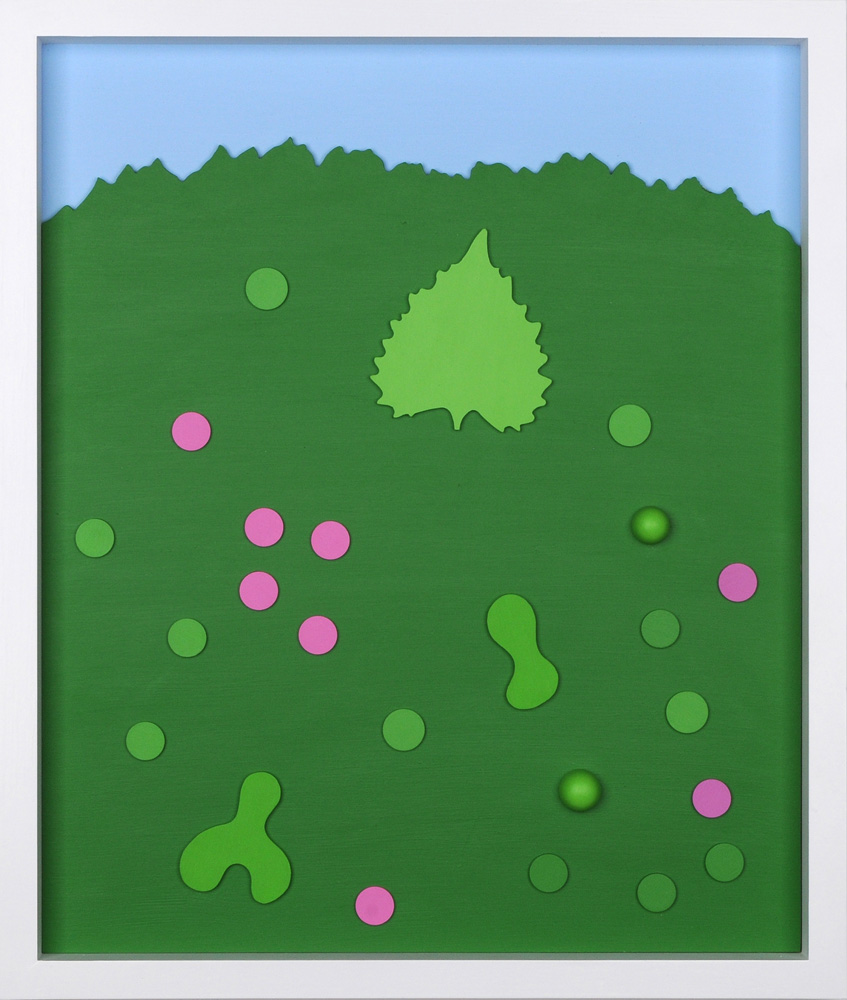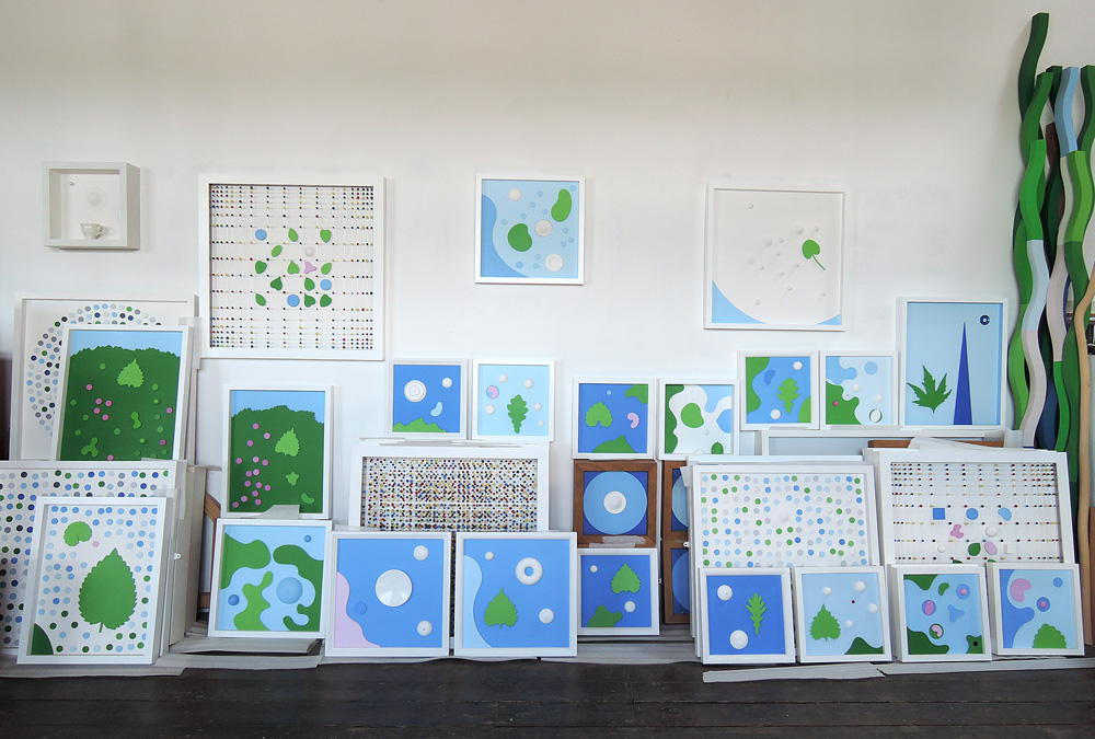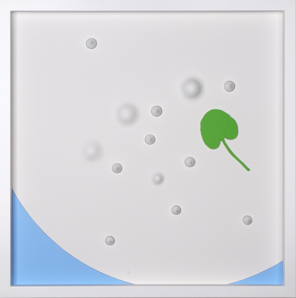 There are conceptual elements in all of the works, even if they look very different. The clues are in the titles. I don’t think up titles, they just jump into my free-ranging brain and announce themselves! ‘Perfect Design’ is just that. Nature designs with varying perfection as does the human brain. A completely different visual approach is embodied in ‘Genesis 4’: the collected Garlic Mustard leaf, the organic Arp-like shapes, the random green elements offset by the contrasting magenta discs and the hazel leaf background resolve into a Norfolk coastal landscape.